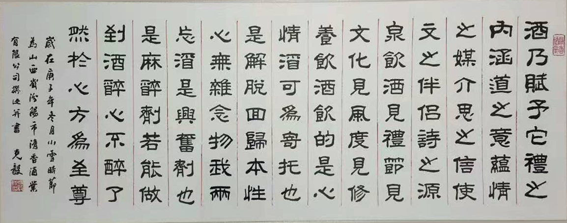 汾陽(yáng)市清香酒業(yè)有限公司座落在中華名酒第一村---杏花村申明亭路9號(hào)。《汾酒曲》中記載,申明亭畔新淘井,水重依稀亞蟹黃 ,注解說:申明亭井水絕佳,以之釀酒,斤兩獨(dú)重。明末愛國(guó)詩(shī)人、書法家和醫(yī)學(xué)家傅山先生,曾為申明亭古井親筆題寫了得造花香四個(gè)大字,說明杏花井泉得天獨(dú)厚,釀出的美酒如同花香沁人心脾。 汾陽(yáng)市清香酒業(yè)有限公司出品的清香型高端白酒用的是優(yōu)質(zhì)高粱、大麥和豌豆等上等原料和申明亭地下礦泉水,再加上杏花村土壤和空氣中獨(dú)有的菌群,在杏花村釀酒匠人的傳統(tǒng)工藝下精心釀造:清蒸二次清,固態(tài)地缸分離發(fā)酵,清字當(dāng)頭,一清到底,釀出的酒:酒液晶亮、清香幽雅、醇凈柔和、回甜爽口、飲后余香,在國(guó)內(nèi)外享有盛譽(yù)。